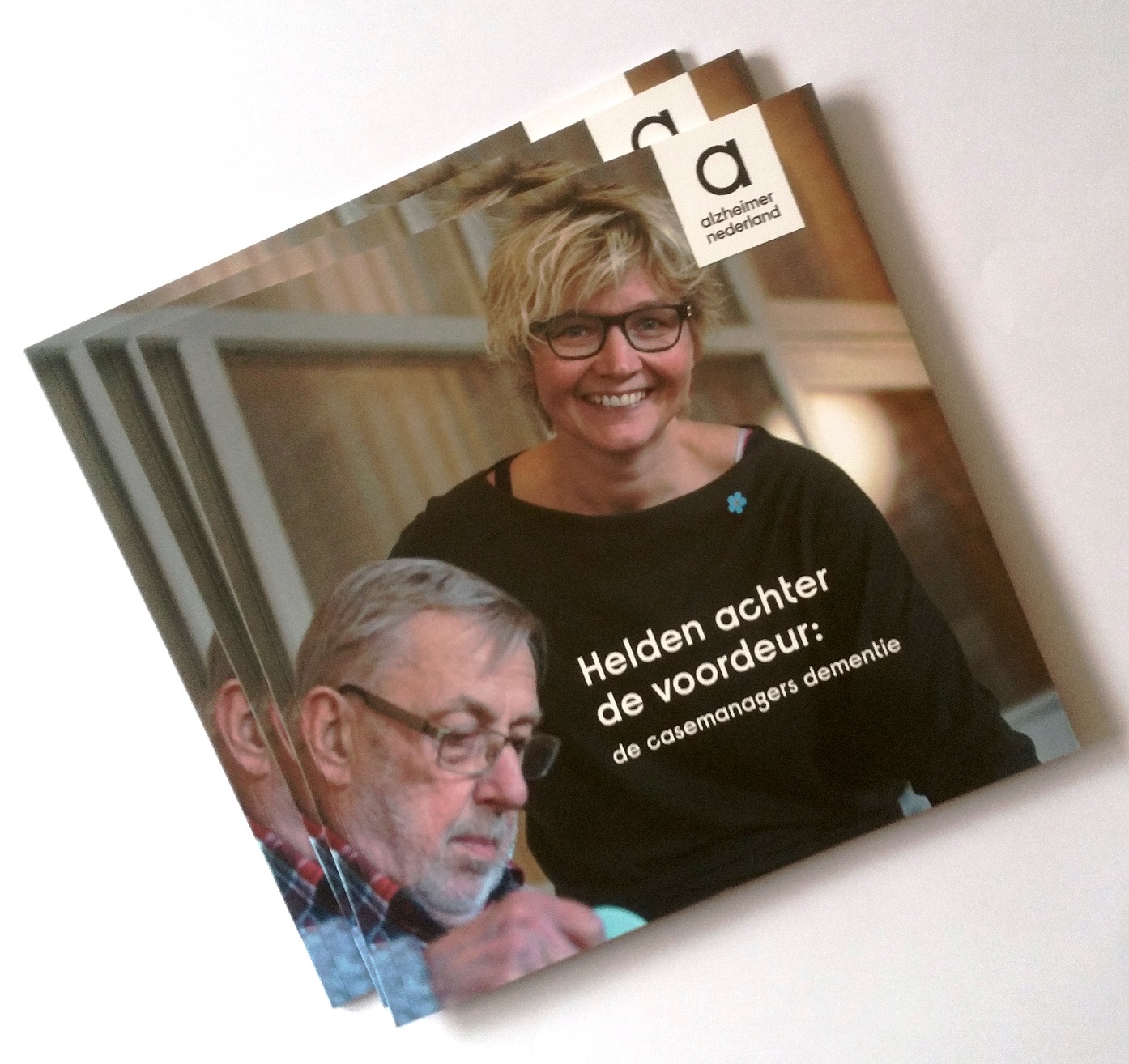 Brochure voor Alzheimer Nederland met inspirerende verhalen van casemanagers dementie. Alzheimer Nederland strijdt ervoor dat naast iedere persoon met dementie een casemanager dementie staat. Casemanagers zijn een belangrijke steun voor mensen met dementie en hun naasten. Dit zijn de helden achter de voordeur. Alzheimer Nederland heeft in dit boekje een aantal mooie persoonlijke verhalen en voorbeelden samengebracht.
